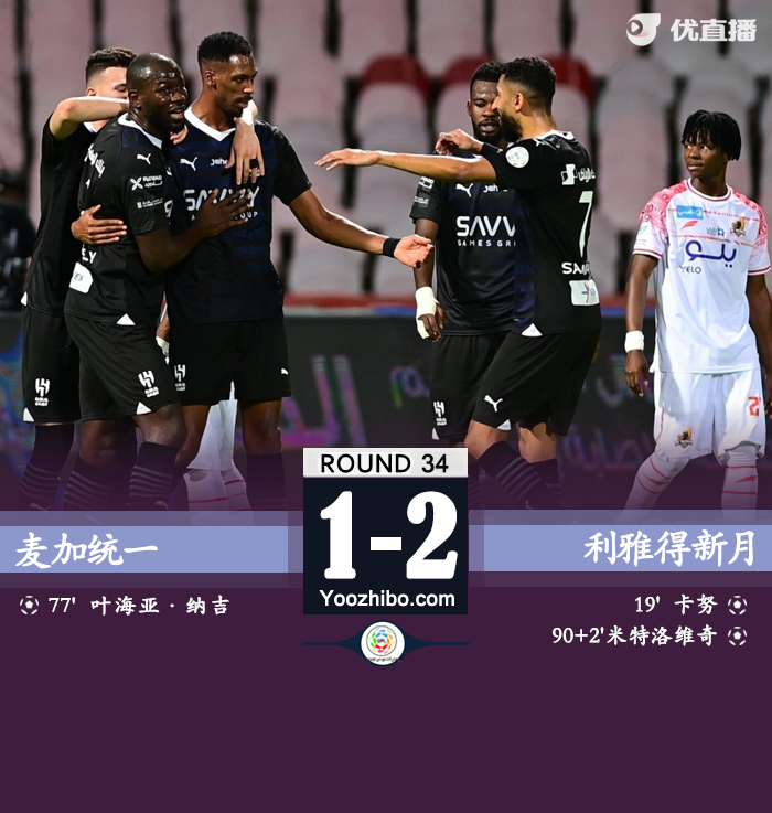 24直播网讯 北京时间5月28日沙特联第34轮,麦加统一迎战利雅得新月。上半场,多萨里助攻卡努头球破门。下半场,麦加统一扳平比分,米特洛维奇补时绝杀!最终,利雅得新月2-1击败麦加统一,本赛季联赛31胜3平不败夺冠收官!