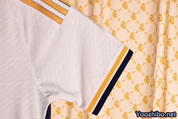 纯白色及其设计美学总能在一瞬间激起世界各地皇家马德里球迷心中的自豪与归属感。主场球衣的设计以拼色为主,简约优雅,以富有层次感的黑金V领作为点缀,侧面还饰有醒目的纵向黑色条纹。