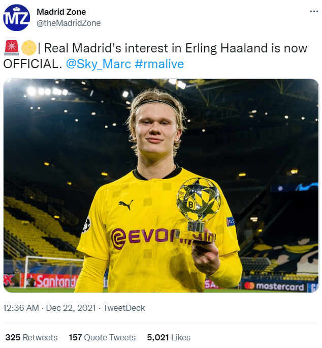 根据此前消息,哈兰德合同中价值7500万欧元的解约金条款将在明夏生效,有许多俱乐部都希望届时能签下这位挪威锋霸,而皇马就是其中之一,银河战舰的目标是在同一个夏天引进哈兰德和姆巴佩。