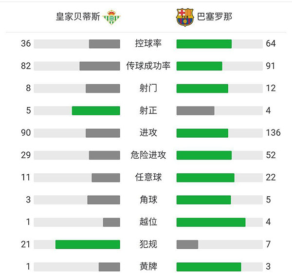 全场比赛结束,巴萨做客3-2逆转贝蒂斯取得胜利。