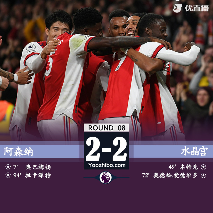 24直播网10月19日讯 北京时间2021年10月19日凌晨3:00,英超联赛第8轮,阿森纳坐镇主场迎战水晶宫。上半场阿森纳凭借奥巴梅扬的破门1-0领先,下半场本特克为水晶宫扳平比分,随后爱德华多再下一城,伤停补时阶段拉卡泽特绝平,最终阿森纳2-2水晶宫。