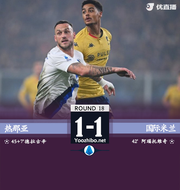 24直播网讯:北京时间12月30日凌晨03:45,意甲联赛第18轮,国际米兰做客路易吉-费拉里斯球场,挑战热那亚,本场比赛主裁判为多维里。上半场,阿瑙托维奇补射打破僵局,德拉古辛头球扳平比分。下半场,阿瑙托维奇爆射制造威胁,阿切尔比头球造险。最终,热那亚1-1国际米兰。