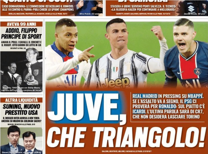 《都灵体育报》表示,姆巴佩已经明确拒绝了巴黎续约了,同时他已经接受了皇马的邀请,他会在今夏披上皇马的战袍、而一旦姆巴佩离队,巴黎会签下一名顶级球星,他们希望得到尤文队内的葡萄牙球星C罗,此前不少媒体表示,C罗希望离队,而巴黎对C罗来说是一个不错的去处,同时尤文近期财政出现了问题,他们也愿意出售C罗来腾出薪资空间。不过,尤文送走C罗之后,需要签下一名顶级前锋,他们看上了巴黎的伊卡尔迪,他们希望巴黎把伊卡尔迪加入C罗的交易。