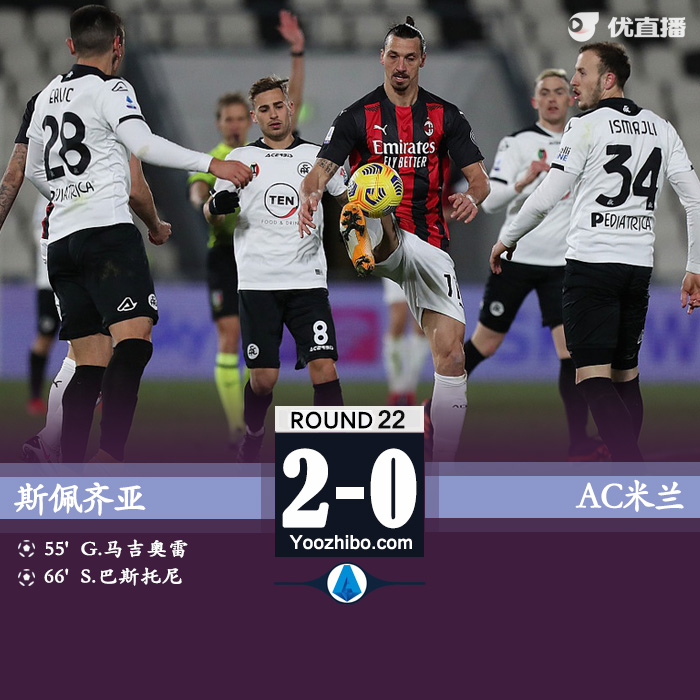 全场比赛结束,AC米兰客场0-2不敌斯佩齐亚。