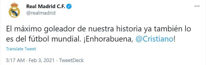 皇马官推写道:“我们的队史最佳射手,如今也是足坛历史最佳射手,祝贺你,C罗!”