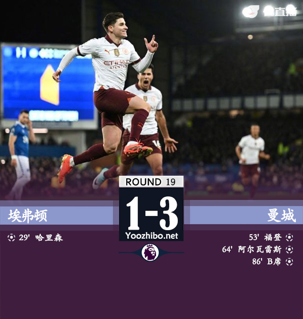 24直播网讯 12月28日讯 英超第19轮,曼城客场对阵埃弗顿。上半场,斯通斯伤退,哈里森破门。易边再战,福登打进世界波,阿尔瓦雷斯点射反超,皮克福德出球失误送礼B席兜射破门传射建功,福登远射中柱。最终曼城3-1埃弗顿。积分榜方面,曼城37分升至第四,埃弗顿16分第17。