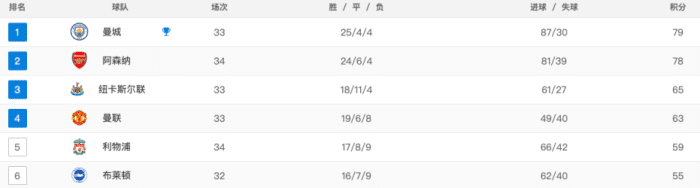 截止到目前,积分榜前两名阿森纳和曼城已经提前获得了下赛季欧冠参赛资格。因为第5和第6名的利物浦和布莱顿即便后面比赛全胜,也无法超越这两支球队。目前英超剩下两个欧冠名额,将会在纽卡、曼联、利物浦、布莱顿这4队之间产生。