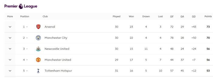 纽卡斯尔在客场0-3惨败于阿斯顿维拉脚下,随后热刺主场被保级球队伯恩茅斯3-2击败,曼联少赛一两场,仍然稳居英超第四。只要周日做客击败诺丁汉森林,红魔即可反超喜鹊,重返英超第三位置。