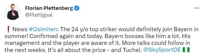 24直播网04月12日讯 ,来自德国天空体育记者Florian Plettenberg的最新消息,效力于意甲领头羊那不勒斯的射手奥斯梅恩今夏将加盟拜仁,目前只有转会费没有谈妥,未来几周将有更多谈判进行。