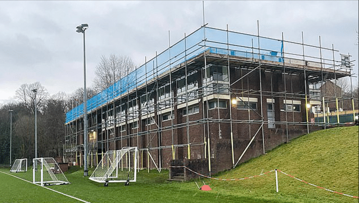 英媒披露,克里夫训练场巨大的室内学校仍在使用,室外的球场也是如此。但看起来像牛棚,脚手架围绕着四周。在主入口处,有一扇窗户有一条大裂缝,经典的红砖头墙上布满了涂鸦。