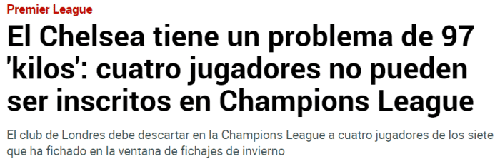 《马卡报》表示,根据欧足联的规定,打进欧冠淘汰赛的队伍,在2月2日之前最多可以注册3名新球员,而切尔西在这个冬窗共引进了7名新援。