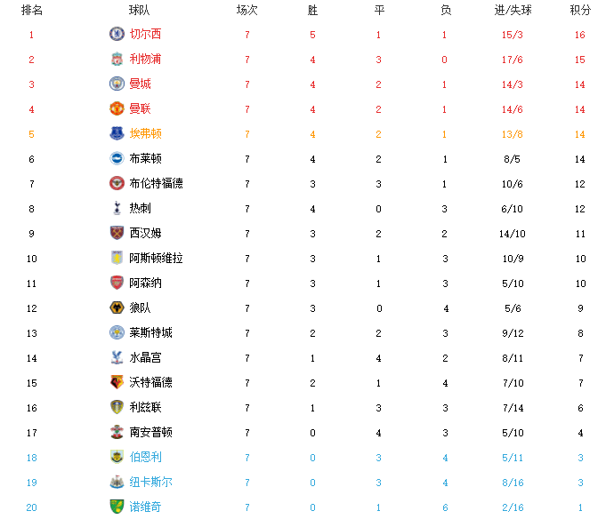 24直播网10月04日讯 随着曼城2-2战平利物浦,英超第7轮正式落下帷幕,本轮切尔西获胜之后升至榜首,第2-6名全都丢分,曼联更是2轮仅仅1分,阿森纳也没有继续连胜脚步。接下来我们一起来看看本轮英超的最新积分榜: