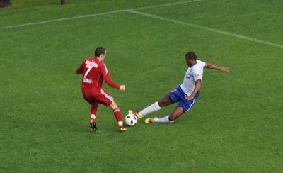 进攻者带球已越过防守队员,防守队员只能从进攻者的侧后方去破坏对手的进攻。此时,防守者可运用铲球技术。当然侧后方铲球是很容易造成球员受伤的,一定要注意。