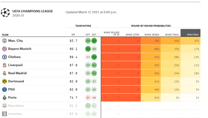 24直播网3月18日讯 随着欧冠八分之一决赛全部的结束,欧冠八强球队也全部出炉了,曼城、拜仁、切尔西、利物浦、皇马、多特、巴黎和波尔图八支球队晋级本赛季欧冠八强。而这八支球队进入八强之后,所有媒体也都开始猜测,到底谁能拿到本赛季欧冠冠军呢?而近日,欧洲权威数据媒体网站“538”利用大数据预测了本赛季欧冠夺冠的几率,其中曼城是独一档的存在,他们是最被看好的球队,而上赛季欧冠冠军拜仁的夺冠几率甚至不及曼城的一半。