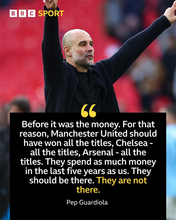 24直播网讯 北京时间5月14日,曼城主帅瓜迪奥拉在出席与热刺的赛前发布会时,回击了外界关于曼城“成功只靠钱”的言论。瓜帅表示,如果成功只靠钱,曼联、切尔西和阿森纳,应该赢得所有冠军。