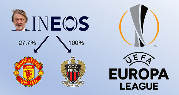 根据欧足联的相关规定,同一实体旗下的两家俱乐部不能参与同一欧洲赛事。如果严格遵守这一规则,那么曼联将失去欧联杯参赛资格,因为尼斯在法甲排名第五,而曼联只是英超第八,同一老板名下联赛名次更高的球队有资格参赛。但欧足联放宽了下赛季规则,曼联和尼斯现在可以在特定条件下参与2024/25赛季欧联杯。