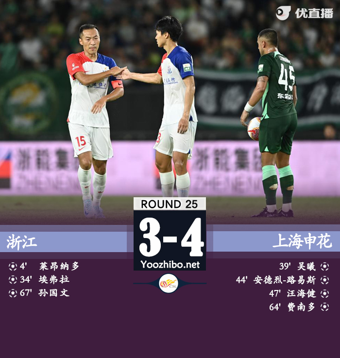 24直播网讯 北京时间9月13日,中国足球顶级联赛第25轮,浙江队主场迎战上海申花队。上半场,莱昂纳多开场不久抽射破门,李提香精准助攻埃弗拉抽射得手,费南多直塞助攻吴曦单刀推射入网,路易斯单刀破门追平比分;下半场,汪海健低射得手反超比分,路易斯传中助攻费南多打入申花生涯首球,孙国文与莱昂纳多撞墙配合后破门,卢卡斯头球绝平被判埃弗拉犯规在先进球无效。最终上海申花队以4-3的比分险胜浙江队。