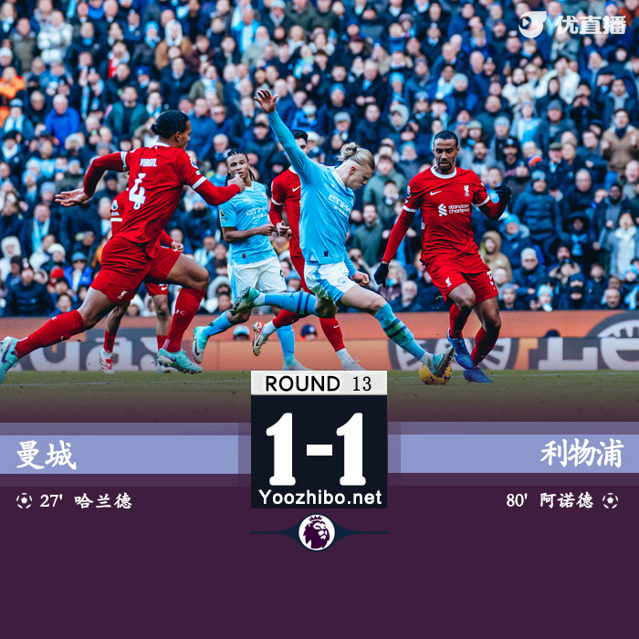 24直播网讯 北京时间11月25日20:30,英超联赛第13轮曼城迎战利物浦的比赛,上半场阿利森开门球失误,阿克助攻哈兰德低射破门创造英超最快达成50球的记录,半场结束,曼城1-0利物浦。下半场若塔伤退,萨拉赫助攻阿诺德扳平比分,最终曼城1-1利物浦,积分榜方面,曼城积29分排在榜首,利物浦积28分排在第2位。